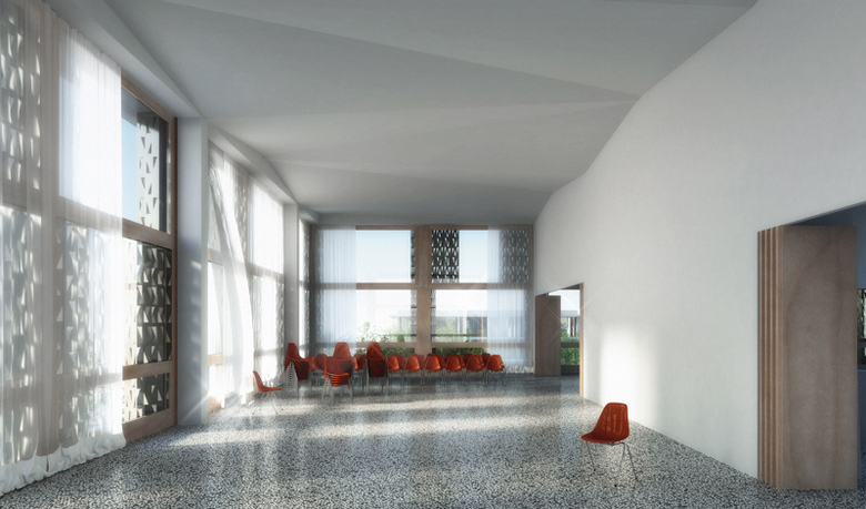 Das neue Zentrum in Küsnacht wird ein Ort des Geschehens; ein urbanes Feld im dörflichen Massstab, das sich als öffentlicher Platz zwischen der Zürichstrasse und dem tiefer liegenden Bahnhof etabliert. Die Verfassenden verfolgen einen klassischen Ansatz von Platzraumgestaltung, bei dem einerseits die Gebäudereihe der Zürichstrasse den Aussenraum begrenzt und andererseits die beiden neu gesetzten Volumen je eine Platzfassade bilden. Dieser Aussenraum öffnet sich als erhobene und unterbaute Terrasse gegen Westen mit breiter Sicht auf See und Berge.