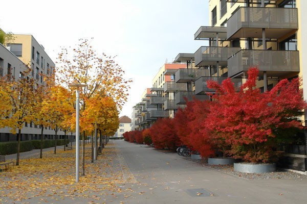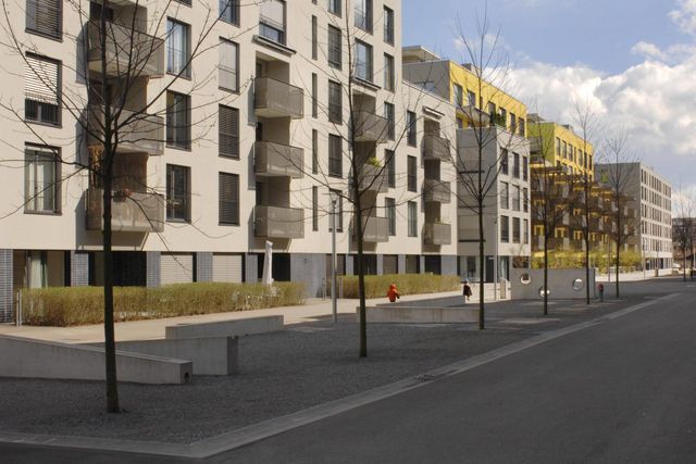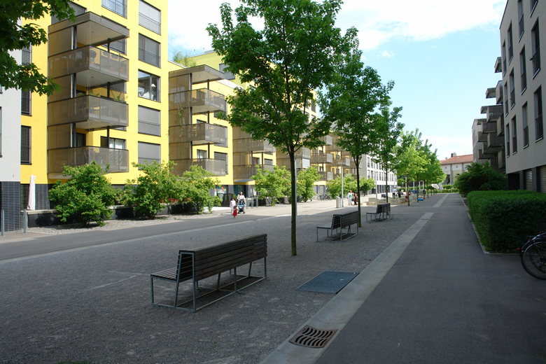 Die in lange Bauzeilen gegliederte Stadtsiedlung wird durch einen wiederkehrenden Wechsel von städtischen Freiräumen und parkähnlichen Grünräumen charakterisiert. Von jeder Ost-West ausgerichteten Wohnung aus ist der Bezug sowohl zu einem „Stadt“- als auch zu einem Grünraum vorhanden. Die langgezogenen Freiräume zwischen den Gebäudezeilen werden durch unterschiedlich dimensionierte Querverbindungen zu einem dichten Wege- und Platznetz ergänzt.