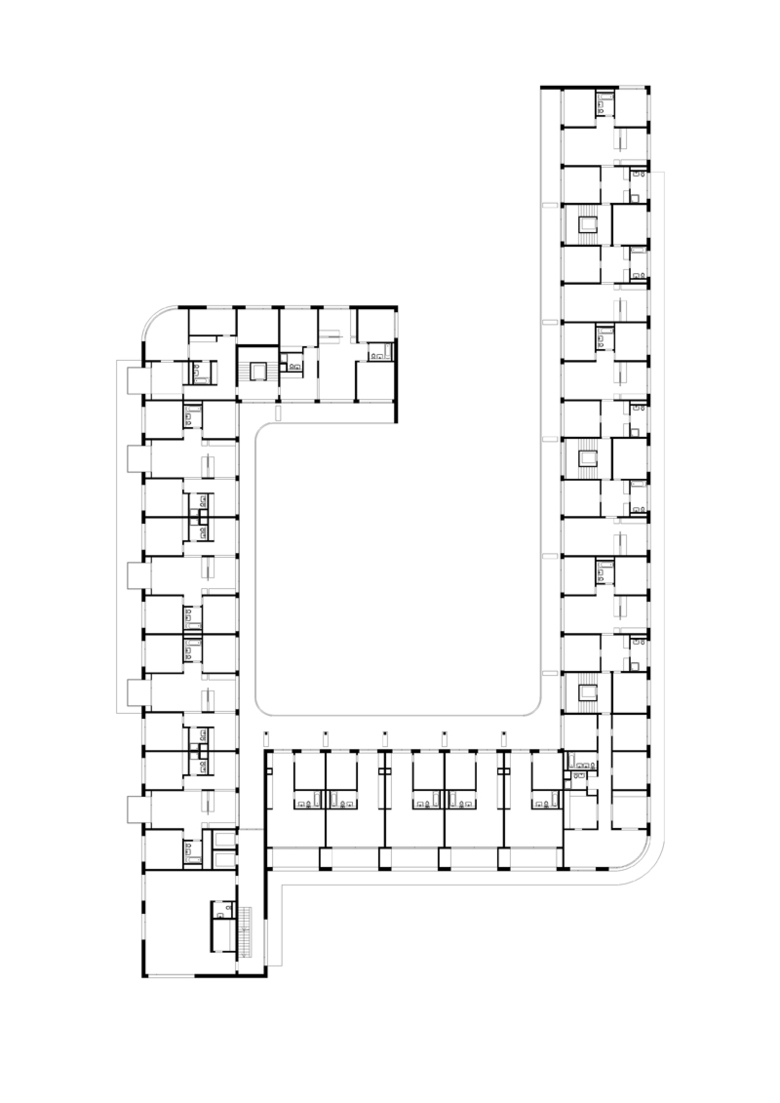 Das Wohnungsangebot erstreckt sich über drei Geschosse, wobei im Mezzanin die Pflegegruppe einen eigenen Flügel belegen. Die 2 1/2-Zimmerwohnungen durchqueren den an den Ladenplatz angrenzenden Baukörper, womit diese nebst einer guten Südbesonnung auch einen lauschigen Laubenbalkon besitzen. Diesen Hof- und Stadtanschluss ist typisch für alle Wohnungen. Die Laubengang- und die Zweispännertypen bieten bei gleicher Grundkonfiguration aber sehr verschiedene Wohnformen an.
