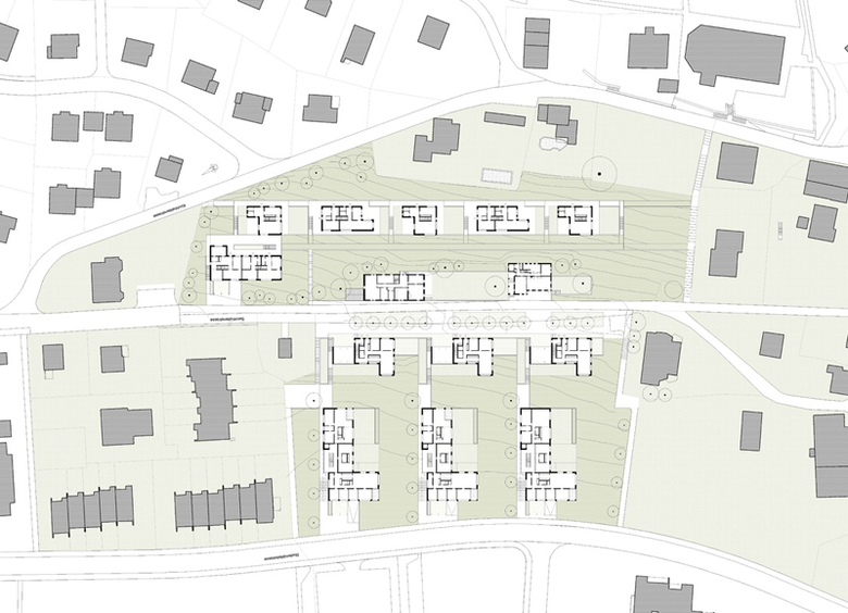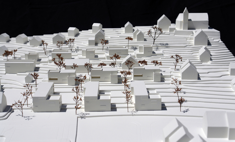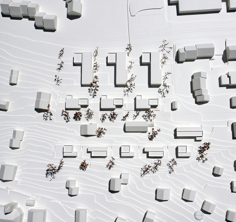 Die Gesamtsiedlung umfasst zwischen 40 bis 50 Wohneinheiten. Die unterste Bebauungsschicht an der Studemättelistrasse weist die grösste Baumasse auf und greift in die Tiefe des Grundstückes. Damit sind Durchblicke und Einblicke in das Sied-lungsgebiet gewährleistet und gleichzeitig werden durch die Paarbildung mit der zweiten Interventionsschicht repetitive siedlungsinterne Hofräume ausgeformt. Die zweite Bebauungsschicht bildet mit den gegenüberliegenden bestehenden Bauten einen kontrollierten ‘Wohn’-Strassenraum, entlang dem alternierend Durch- und Ausblicke mög-lich bleiben. Dieser ist gleichzeitig Auftakt und Ausgangspunkt für die vierte und oberste Intervention. Der vorgeschlagene Eingriff mit der durchgehenden Plattform soll das sensitive, schwierig zu erschliessende und steile Gelände oberhalb der Sennhüttenstrasse nutzbar machen. Der kontrollierte Einsatz der abgestuften Terrassen wird einen schonenden Um-gang mit dem verbleibenden Grünraum ermöglichen, indem die nutzbaren Aussenwohnflächen den Bewohnern präzise zugewiesen sind.