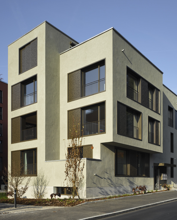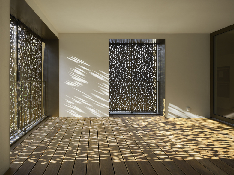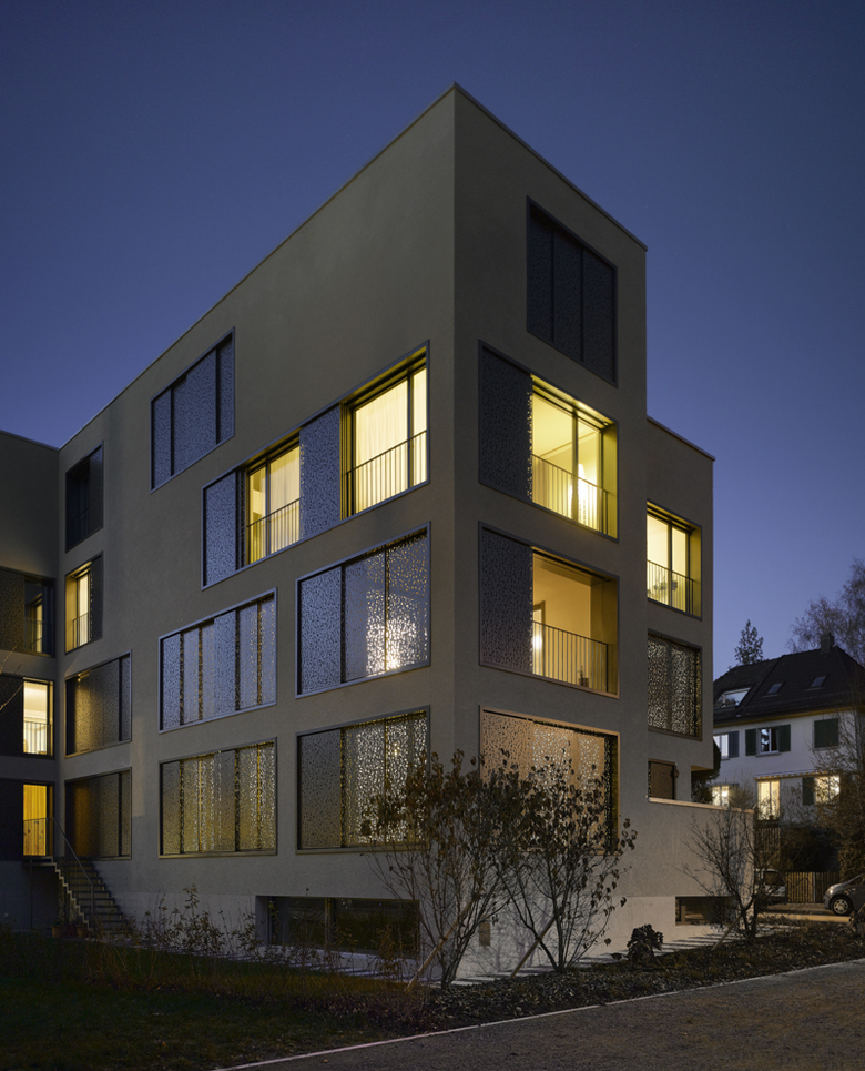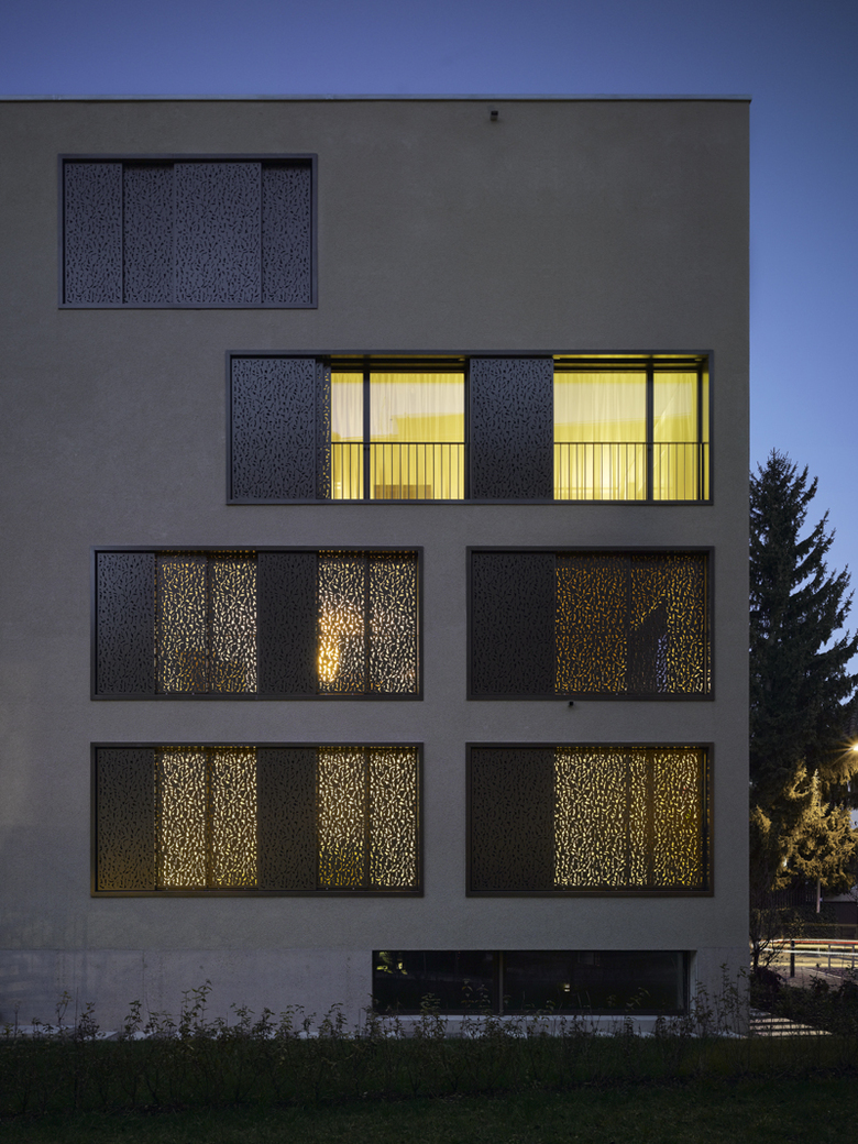 Die mit floraler Geometrie perforierten Schiebeläden leisten einen genügenden Sonnenschutz bei gleichzeitig gewünschter Durchlässigkeit für das Tageslicht und der Kontrolle über die Ein- und Aussichten.