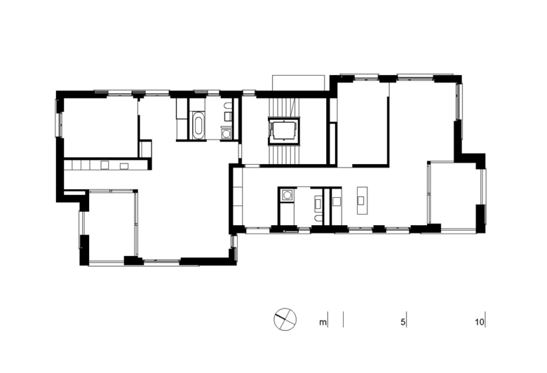Das Bauvolumen beherbergt in den obersten beiden Geschossen zwei 4 ½ Zimmer Maisonettewohnungen, im Zwischengeschoss zwei 2 ½ Studiowohnungen und im Hochparterre eine 6 ½ Zimmer Familienwohnung mit Gartenabgang. Die Terraingefälle ermöglicht zudem die Integration eines 3 Meter 50 hohen Ateliers im Tiefparterre.