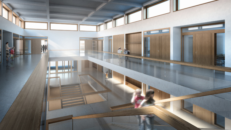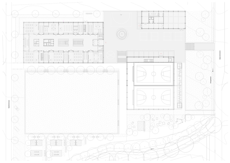 Andererseits werden die Schüler und Schülerinnen das Schulareal vorwiegend über die Maienrainstrasse erreichen, weshalb die Projektverfasser im Nordosten einen zentralen Empfangs-, Schul- und Spielhof vorschlagen, um den sich die drei betrieblich komplett unabhängig nutzbaren Schulbauvolumen anlagern. So entsteht bereits ab der ersten Bauetappe ein massstäbliches Ensemble mit Schulgebäude, Turnhalle und Mehrzweckraum.