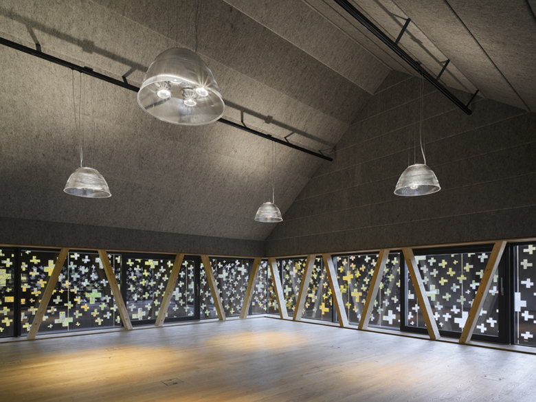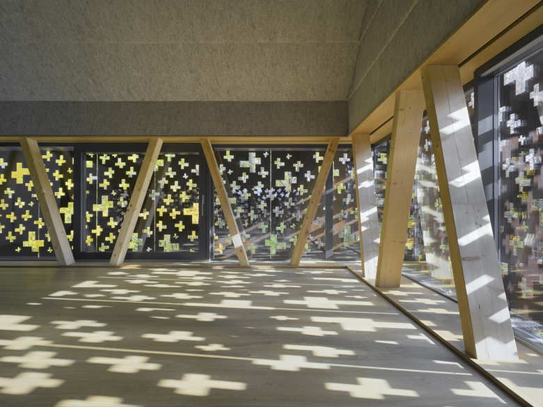Die Anordnung der Programmelemente folgt der Regel eines typischen Besuchsablaufs. An vorderster Stelle bei der Ankunft befinden sich die gedeckten Kassen- und Infoschalter sowie der Geldautomat. Unmittelbar danach und räumlich mit den Kassen eine Einheit bildend, folgt der grosszügige und dreiseitig mit Licht durchflutete Souvenirshop. Im darüber liegenden Obergeschoss stemmen wandhohe Fachwerkträger einen geschlossenen Dachraum in die Höhe und bilden auf diese Weise einen geräumigen Mehrzwecksaal, der sich dank eigenem Zugang autark betreiben lässt.