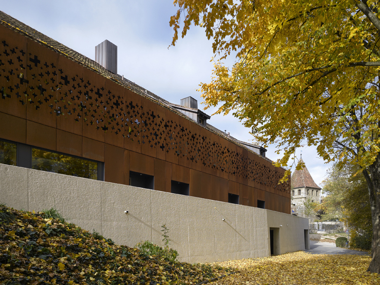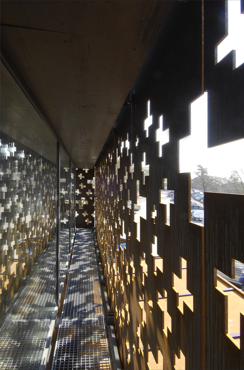 Das lang gestreckte einheitlich mit Tonziegeln belegte Satteldach sowie die allseitig glatte Umhüllung der Fassade reduzieren das Bauvolumen auf eine rohe architektonische Primärform. Die brachiale Materialität der Fassadenbleche aus wetterfestem Stahl wird verfeinert durch eine Perforation der Bleche, deren Ausprägung an Stickertücher erinnern. Die aufgefalteten Vordächer in der Süd- und Westfassade enthüllen die Materialität der zweiten dunklen Fassadenebene und erlauben gleichzeitig durch die grossen Verglasungen einen tiefen Blick in die publikumsintensiven Bereiche. Der gleichen Einfachheit verpflichtet sind die mit Lärchenholz ausgekleideten Fensterfutterale, Wandverkleidungen und Möbel des Souvenirladens und des Restaurants.
