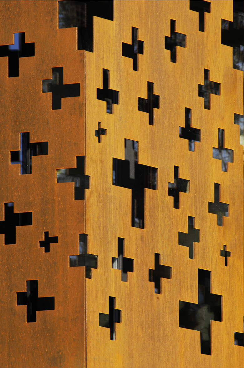 Konstruktiv überlagern sich beim Besucherzentrum im Kern ein Massivbau mit einem Holzständerbau; das Ganze verpackt mit einem Kleid aus wetterfestem Stahl. Die Heterogenität der Geschichte wird so homogenisiert und für den guten Zweck aufbereitet.