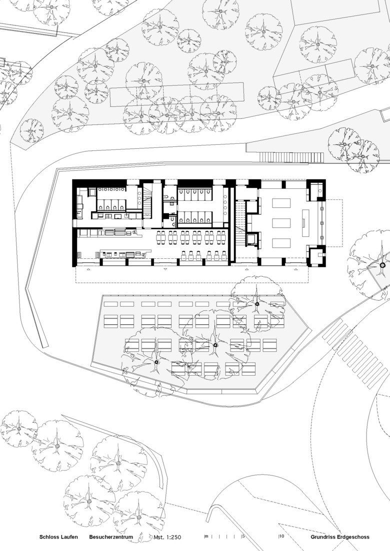 Das dem Schloss vorgelagerte Besucherzentrum - hervorgegangen aus dem früheren nach Süden erweiterten Personalhaus - ruht zurückversetzt, knapp am Rand des Terrassensockels und eröffnet gegen Südwesten einen grosszügigen Platz als Freilichtbühne für die schnelle Gastronomie. Für die ankommenden Besucher ist die freie Sicht auf die Schlossanlage eröffnet.