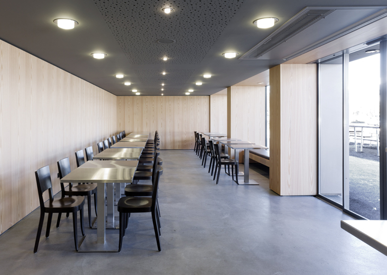 Im Erdgeschoss folgt das Selbstbedienungsrestaurant mit Gastraum für die schnelle Verpflegung. Eigentlicher Gastraum ist aber die vorgelagerte Terrasse, die im Norden zusätzliche Sitzplätze mit Sicht zum nahen Kinderspielplatz und hinunter zum Rhein anbietet.