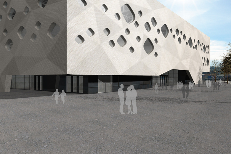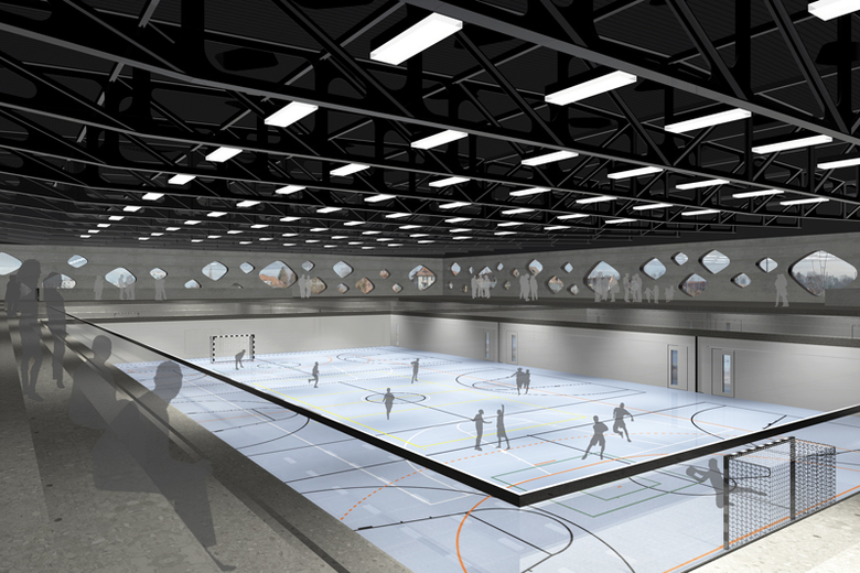 Das Konzept der Halle über der Halle konzentriert die Nutzungen auf eine relativ kleine überbaute Fläche. Der damit frei gespielte grosszügige Aussenraum ermöglicht die Entflechtung der vielfältigen Nutzungen im Umfeld der Sportanlage.