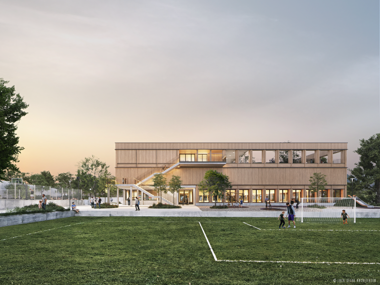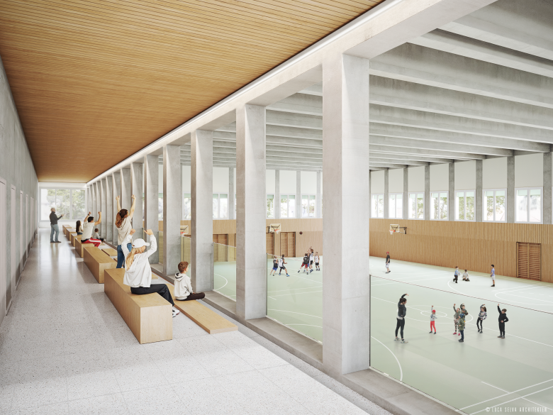 Die räumliche Ordnung der bestehenden Schulanlage mit einer Ansammlung von Bauten aus unterschiedlichen Epochen im Unterdorf von Langnau am Albis wird durch den präzisen Eingriff geklärt. Mit der neuen Dreifachturnhalle, die in ihrem obersten Geschoss auch die Tagesstrukturen aufnimmt, werden die Aussenräume in ihren Beziehungen zum Bestand und zum Neubau präzisiert und es entsteht – zusammen mit dem Inline-Hockeyfeld – eine selbstverständliche neue räumliche Ordnung, welche die Qualitäten des Ortes in die Zukunft trägt. Der Neubau ist eiffizient konzipiert und trägt als Holz-Beton-Hybridkonstruktion den zeitgemässen Anforderungen an eine umfassend verstandene Nachhaltigkeit Rechnung.