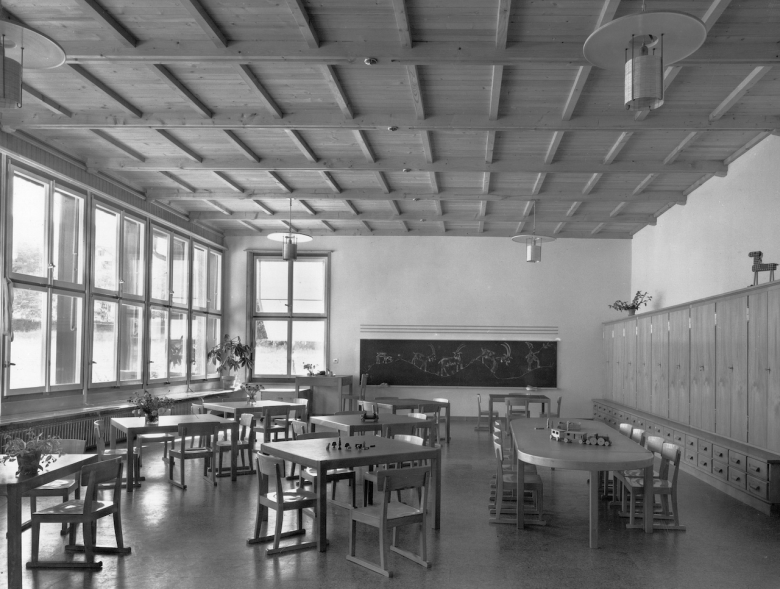Die früher noch locker bebaute Umgebung liess dem Architekten Rudolf Küenzi (Kilchberg bei Zürich) freiere Hand für die Gestaltung dieses Kindergarten-Pavillons. Ein Wettbewerb (1946) hatte die Grundlage für diesen Bau geschaffen. Die beiden Spielzimmer, jedes mit seinem eigenen Spielplatz im Freien, sind so angeordnet, dass sich beide Klassen auch bei Freiluftunterricht nicht stören. Der Zwischentrakt und die Südostseiten der beiden Spielzimmer sind in Holz konstruiert, die drei andern Saalwände sind aus Backsteinmauerwerk.