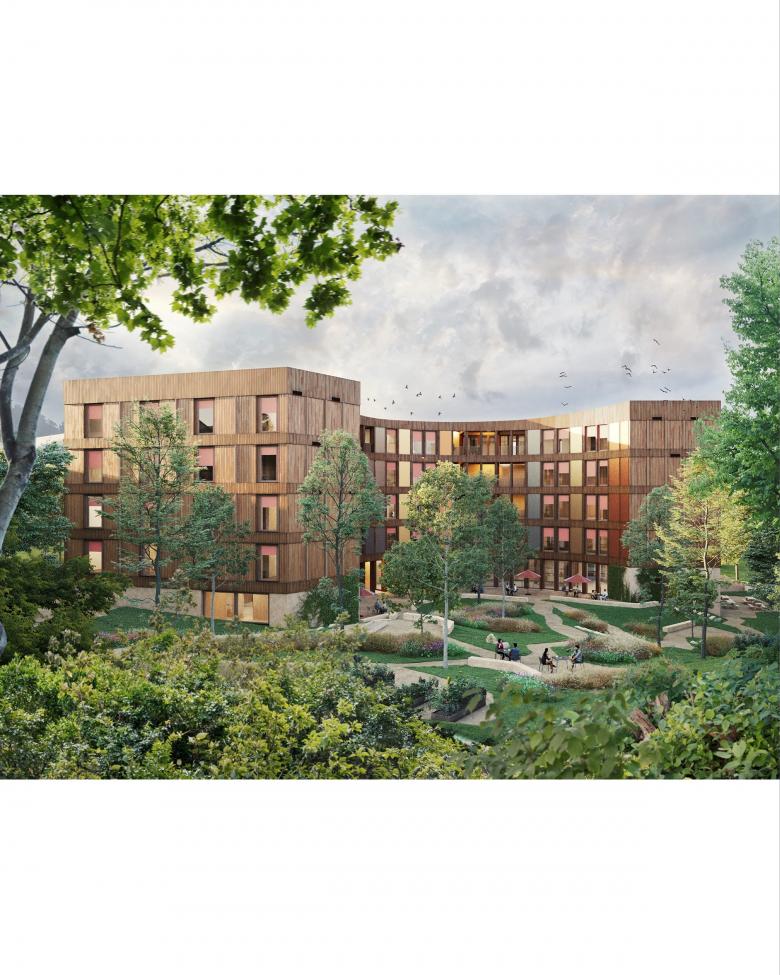 Wir haben mit dem Projekt für das Pflegezentrum am Bruderholz eine neue Typologie für Pflegeheime entwickelt, bei welcher die Zimmer konsequent vierseitig nach Aussen orientiert und den Aufenthaltsbereich auf einen gemeinsam erlebbaren Freiraum richtet. In diesem Heim gibt es Bewohnende, welche 20 Jahre und mehr an diesem Ort leben. Umso wichtiger sind hier gute Räume für den gemeinsamen Aufenthalt, wo Menschen zwar Nischen haben und dennoch sichtbar bleiben, wo sich den Menschen auf ihrem Stockwerk eine reiche Welt offenbart, eine Welt um bestehende grosse Bäume herum, die sich im Zyklus des Jahres sich immer neu präsentieren. Um diese Bäume herum entwickelt sich ein zirkulärer Aufenthaltsraum, der die notwendige Erschliessung mit den Aufenthaltsräumen koppelt und so einen wunderbaren Begegnungsraum schafft, der pro Geschoss auf die drei geforderten Wohngruppen zugeteilt werden kann Denn der Ersatzbau folgt weitgehend dem Fussabdruck des leider typologisch kaum anpassbaren Vorgängerbaus, nutzt dessen Baugrube und erlaubt so den Weiterbestand der kapitalen Bäume.