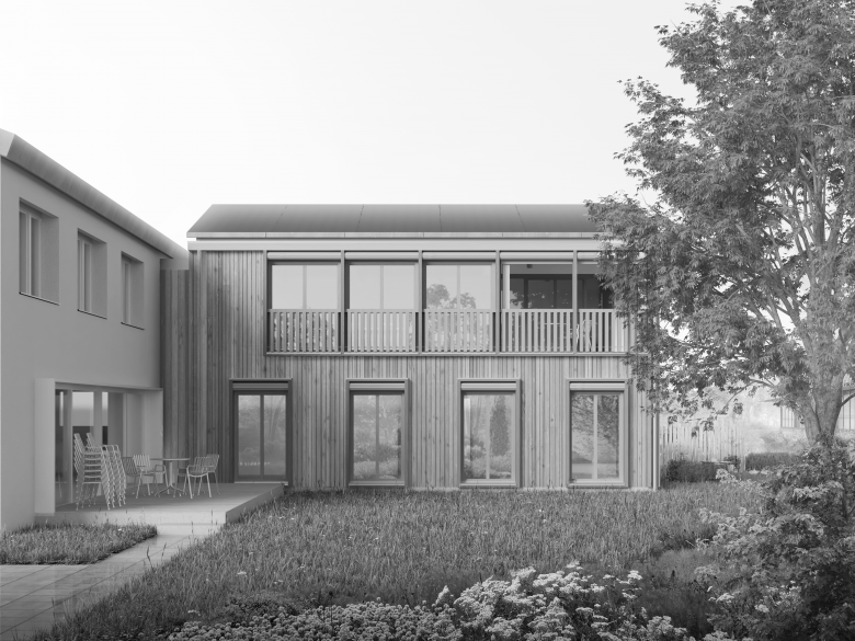 Mittlerweile in der ‘empty nest’-Phase angekommen und mit Blick auf eine altersgerechte Wohnsituation gehen die Überlegungen der Auftraggeberschaft in Richtung einer horizontalen Erweiterung des Hauses, was ihnen die Möglichkeit gibt, auf einer Ebene zu wohnen und das darüberliegende Geschoss zu vermieten. Verdichtung und Barrierefreiheit in einem Zug.