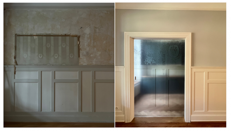 Das repräsentative Town-House an der Marschalkenstrasse in Basel wird mit maximal zurückhaltenden Mitteln umfassend instandgesetzt. Die Oberflächen werden erneuert – und wo möglich – wieder in ihren ursprünglichen Zustand zurückgeführt.Mit einem schönen Farbkonzept werden die Räume stimmungsvoll inszeniert. Der einzige Eingriff – siehe Bild – ist ein neuer Wanddurchbruch im Bereich des Brusttäfers zwischen Küche und Esszimmer. Das aufgedruckte Bild auf dem Glas der Schiebetüre ist Abbild des zerstörten Bestandes und bewahrt dessen Erinnerung.