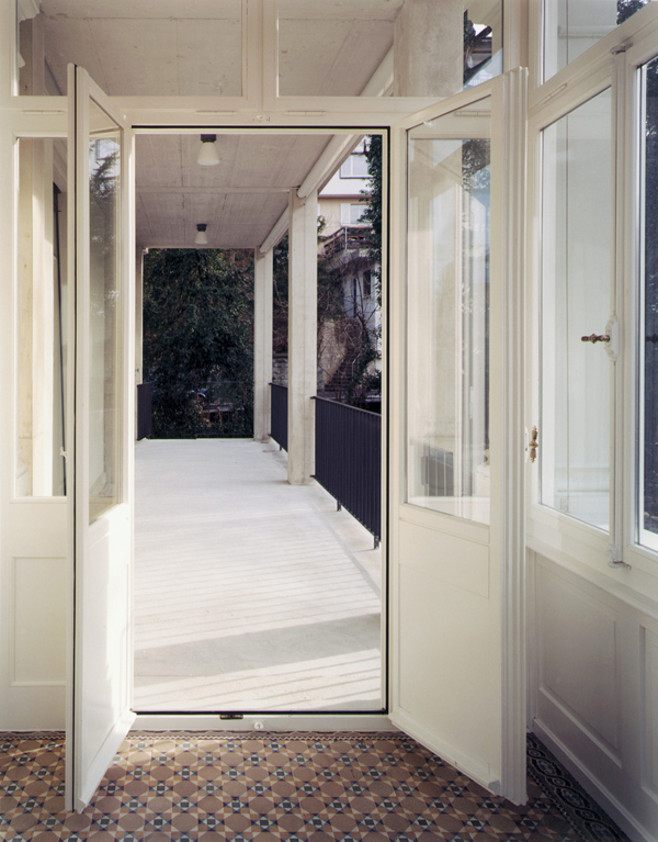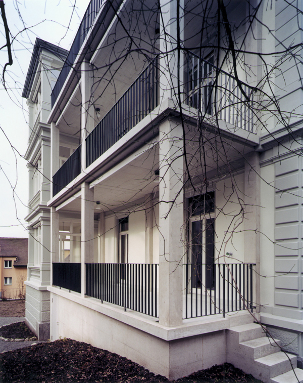 Eine Bereicherung ist der neue, grosszügige und offen gestaltete Balkon auf der Südseite. Die massive Erscheinung in hellem Sichtbeton, die Angliederung an die bestehende Veranda sowie die Betonung der Horizontalen verhindert, dass der Balkon, trotz seiner Grösse, die gesamte Fassade dominert.