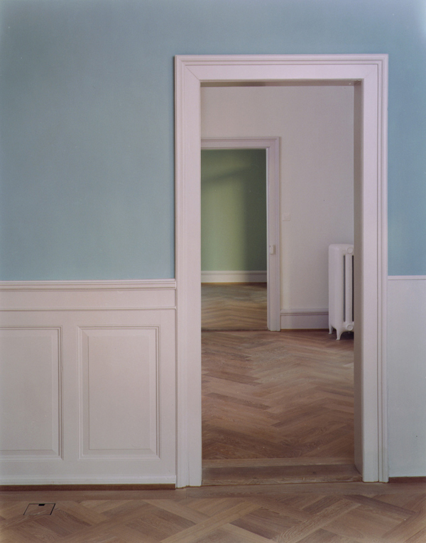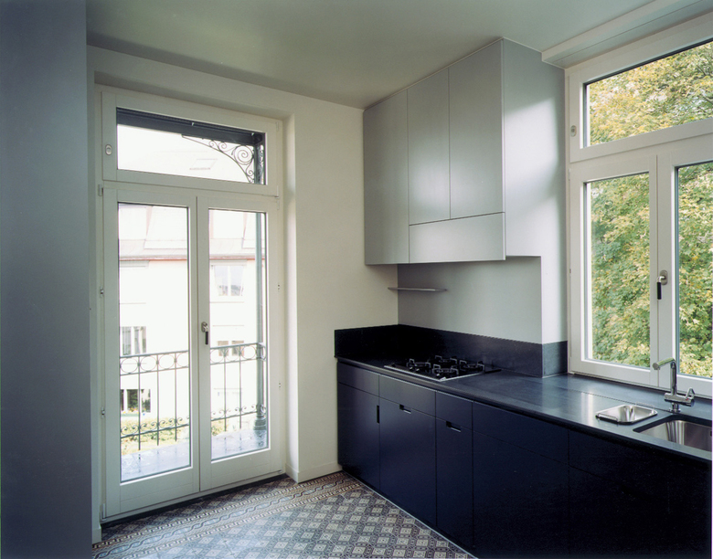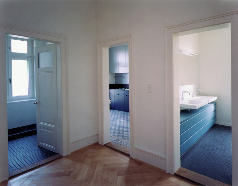 Die Hauptgeschosse mit den stattlichen Wohnungen werden integral erhalten. Entsprechend dem Ausbaustandard der Etagenwohnungen ist vor allem eine Erneuerung der Küchen und Bäder notwendig. Das bestehende, eher kleine Bad wird mit einem Klosett ergänzt. Im Bereich des jetzigen WC- und Vorratsraumes wird eine zweites Badezimmer mit Dusche angeordnet. Die Küche mit dem dekorativen Plattenbelag bleibt in ihren ursprünglichen Ausmassen erhalten.