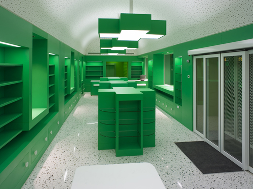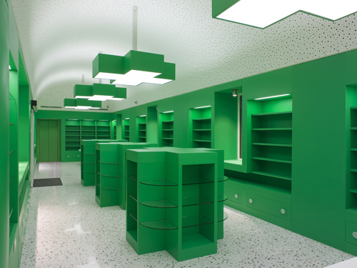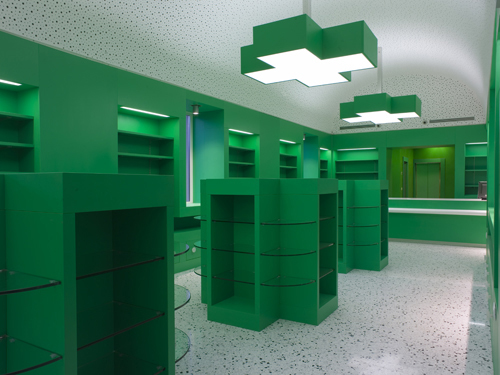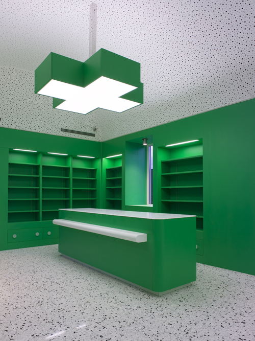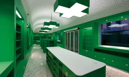Il progetto riguarda la ristrutturazione di un fabbricato dei primi del ‘900, appendice della stazione ferroviaria, da tempo non più utilizzato. Il locale di forma rettangolare allungata ha una superficie complessiva di circa 200 mq, di cui la metà, nella zona centrale, è riservata alla vendita di farmaci, profumeria e parafarmaceutici. La superficie rimanente ospita un ufficio, un laboratorio per la preparazione dei farmaci, un locale analisi, un magazzino, gli spogliatoi per il personale ed alcuni locali di servizio. Gli interni, tutti su disegno, richiamano l’iconografia classica della farmacia, la croce verde, che la rende immediatamente riconoscibile. Con la croce è risolto il sistema di illuminazione del salone e anche parte del sistema espositivo. Tutto di colore verde.