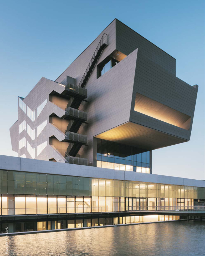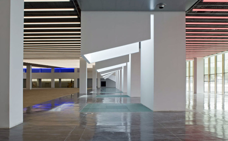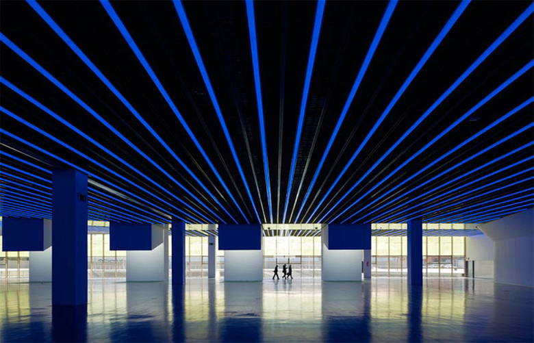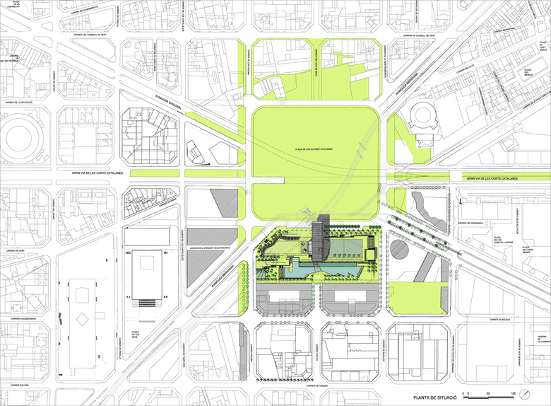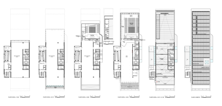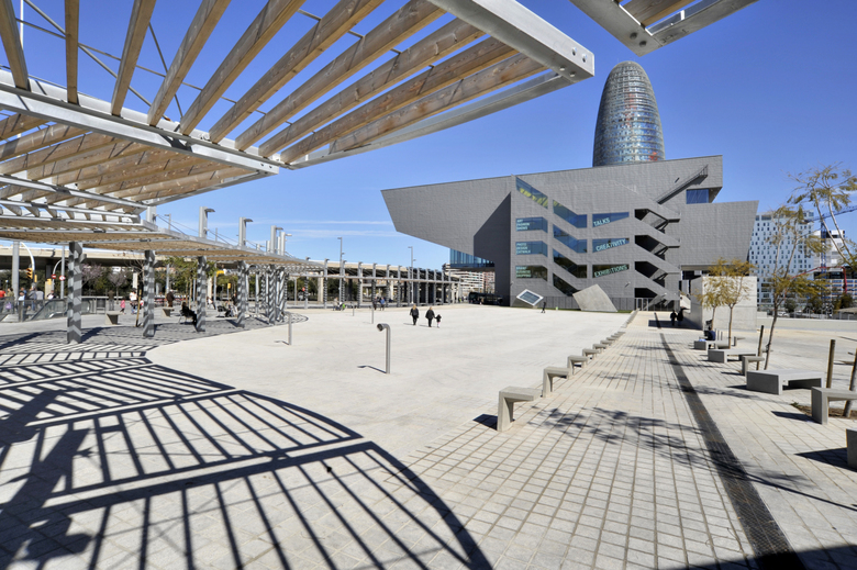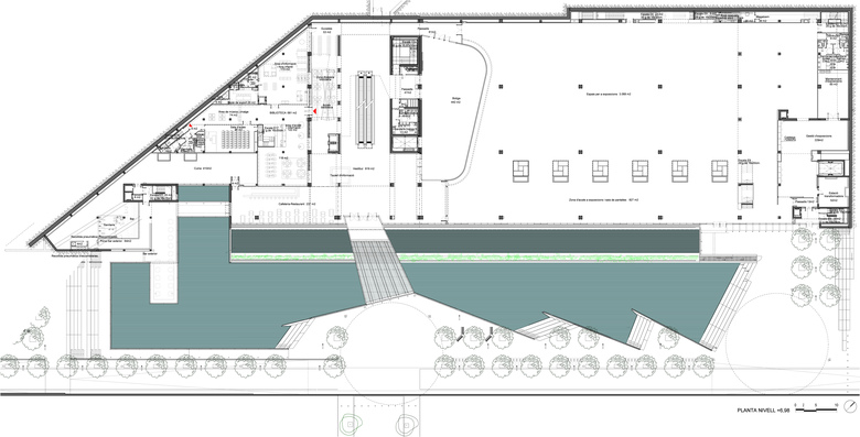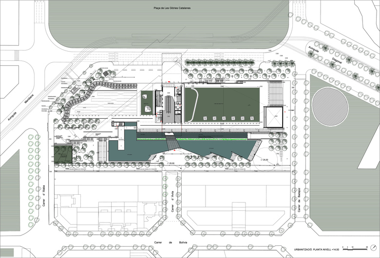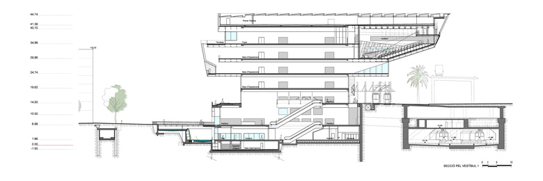 The Disseny Hub Barcelona building contains the Design Museum of Barcelona with the collections of the Museum of Decorative Arts, the Museum of Ceramics, the Museum of Textiles and Clothing and the department of Graphic Arts. Apart from these house the Municipal public library “El Clot-Josep Benet”, the offices of FAD (Foment de les Arts i del Disseny) and the BCD (Barcelona Centre del Disseny). The building is composed of two parts: basement floors (using the topographic difference in levels of approx. 8.00m) and the five floor anvil shaped building that uses the 33m cantilever to reduce its footprint to occupy the minimum public space of the future park. A sunken canal allows the southern light to enter the basement floors. A public pedestrian street runs through the lower floors of the “anvil” linking the lower district with the metro-station and with escalators up to the park and tramway. The upper floors contain permanent exhibition halls and a 200 seat auditory. The East basement contains the main 8m high exhibition hall and below it the reserve collections, workshops, research laboratories and offices. The building is set within a new public space forming part of the future Plaça de les Glòries.