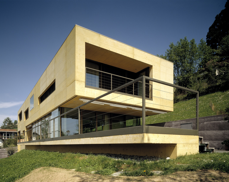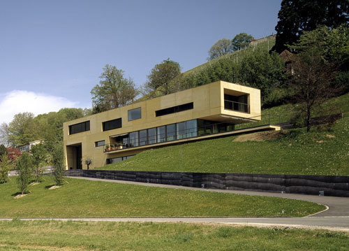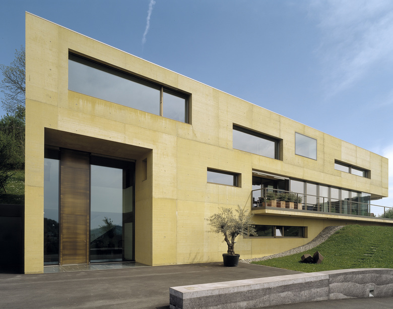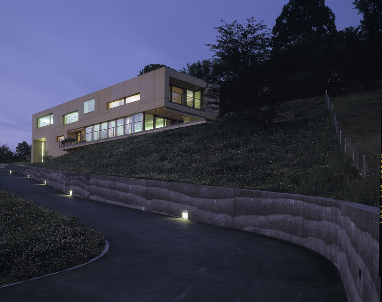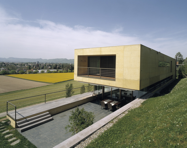 Das Einfamilienhaus aus zweischaligem, eingefärbten Beton entwickelt sich parallel zum Hang. Seine Innenräume spannen Sichtachsen zum Schloss Lenzburg nach Norden und in die freie Landschaft nach Süden auf.