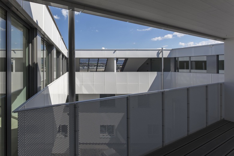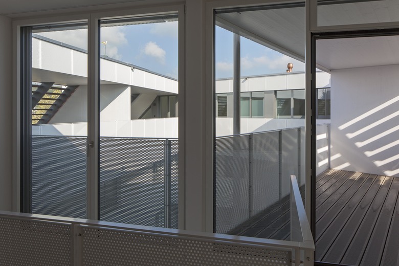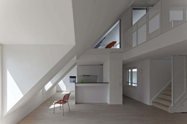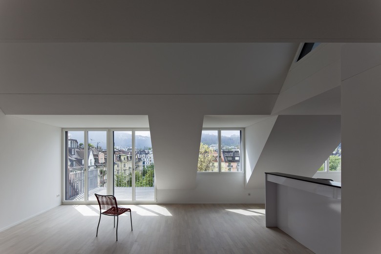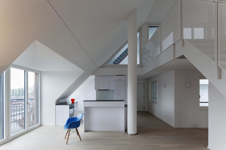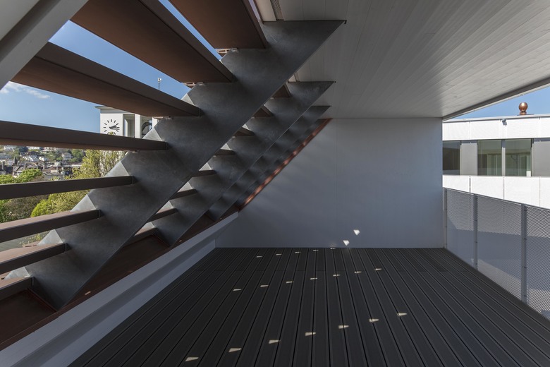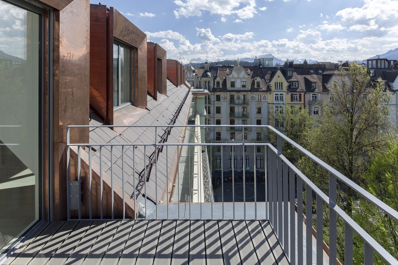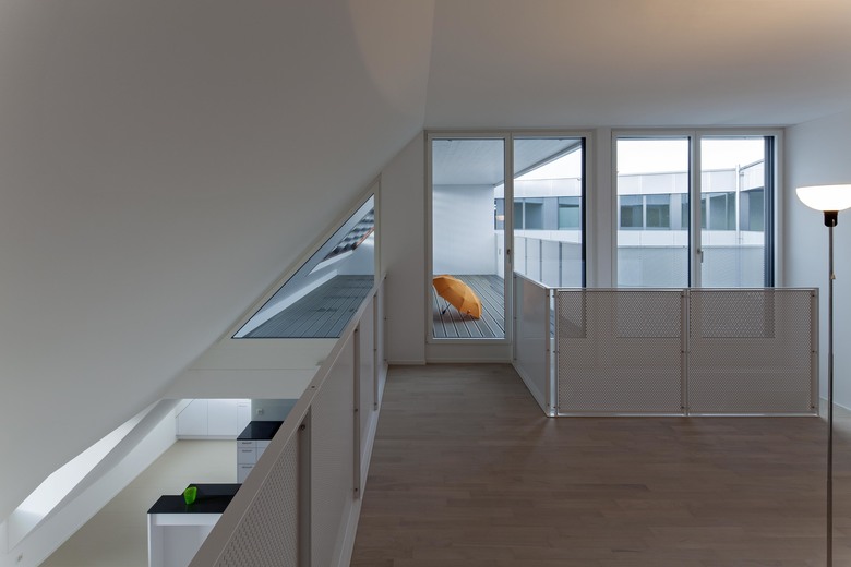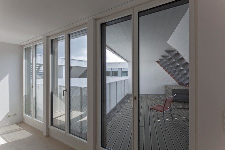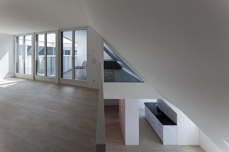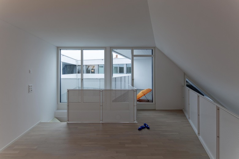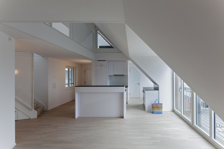 Das bestehende Dach wurde abgebrochen und innerhalb der gegebenen Dach- und Ausbaulinien mit einem Holzelementbau neu aufgebaut. In beiden Gebäudelangseiten wurden Terrassenbereiche für die fünf neuen Wohnungen ausgespart. Deren Ausschnitte erhielten jeweils einen Einsatz aus horizontal laufenden Terracotta-Lamellen, die im Sinne eines leisen Auftritts in Position und Farbigkeit präzise auf die Ziegel abgestimmt wurden.