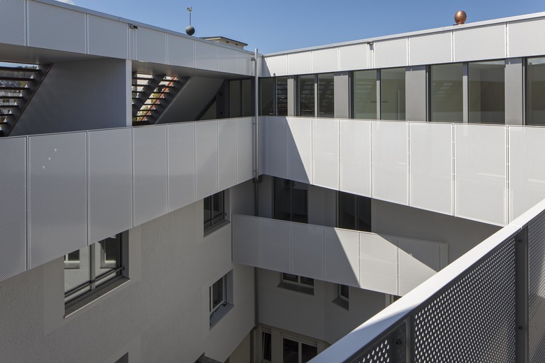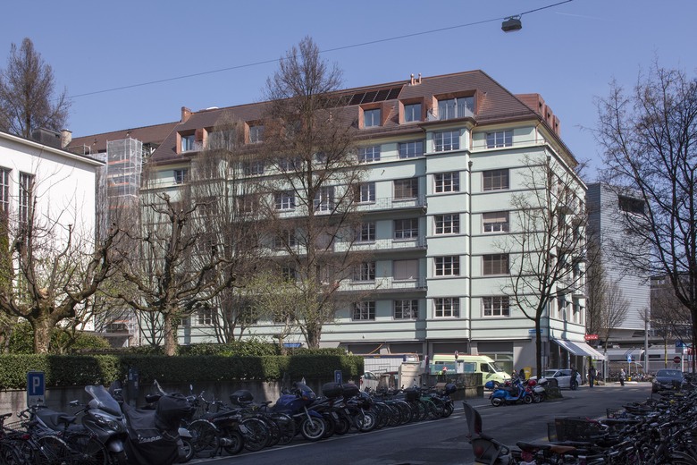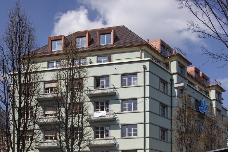 Die vier Wohnungen im bestehenden 5. OG wurden neu renoviert. Die Fassade wurde nach Befund neu gestrichen.