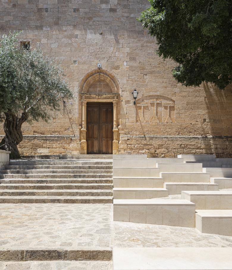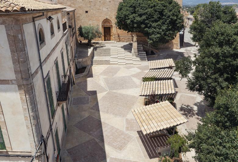All materials and construction techniques were locally sourced, giving the square a distinctly Mallorcan character. The new paving system replaces curbs and asphalt with a unified, barrier-free surface. A narrow one-way traffic lane remains, visually minimized and marked by bollards.