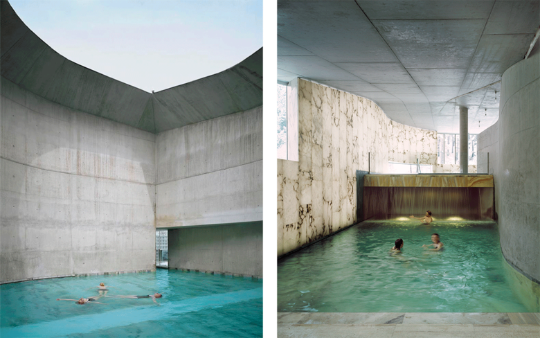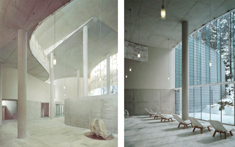 The program is complex, and the municipal zoning limits require that much of the floor area be located underground, making the provision of natural light and views of the surroundings to the maximum area of the plan a design priority. The carving out of the building volume and the strategic location of windows serve to connect the interior spaces with the mountain landscape, giving the visitor a series of orientating cues and embracing him in an atmosphere of wellness and serenity. On the other hand, the overlapping ribbons envelop and blend the spaces as they weave through the interior. On the main level are the pools and saunas, with one exterior and three interior hot pools, Turkish baths, cold baths, ice baths, saunas, showers, foot baths, relaxing areas, and juice bars.