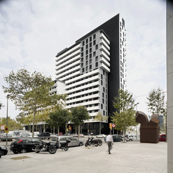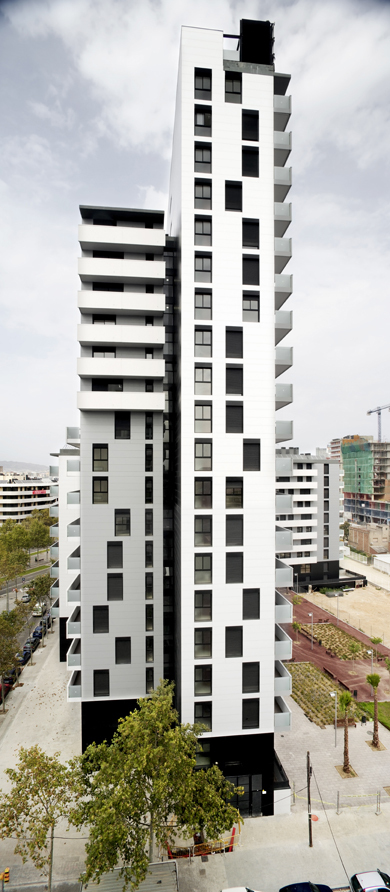 En la esquina con la calle Fluvià, el edificio incrementa su altura a planta baja más dieciséis pisos y, finalmente, a planta baja más diecinueve pisos, volumetría que se relaciona con la de la torre próxima de la UA10, de 86,00 m de altura, y con el edificio de vivienda social situado al otro lado de la calle. El crecimiento en altura se produce por estratificación de las bandas destinadas a vivienda y configura la fachada a la avenida Diagonal como un frente a base de planos superpuestos.