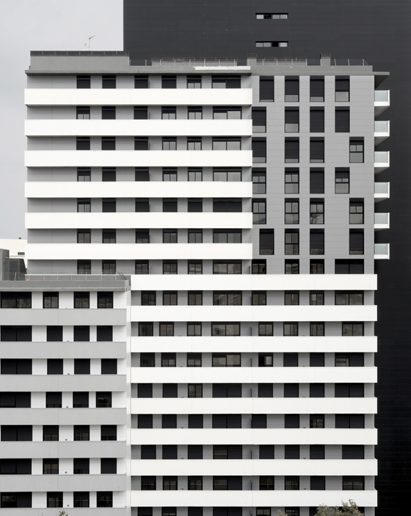 Se propone un tratamiento unitario para toda la fachada, resuelto con un sistema de ventanas balconeras y paños de fachada ciega realizados con tecnología de fachada ventilada construida totalmente en seco. Sobre esta tensa fachada se proyecta un sistema de terrazas en voladizo, con barandillas prefabricadas de hormigón.