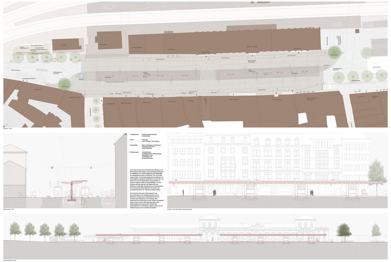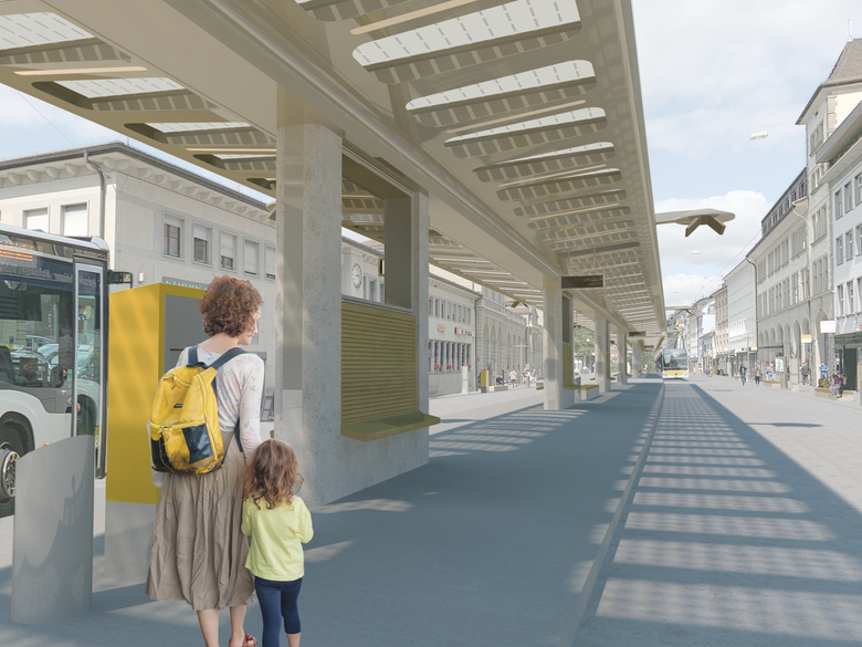 Indem die Wartehallen die Mitte des längs gerichteten Platzes besetzen spielen sie die identitätsstiftende Platzfassade der Altstadt- beziehungsweise des Bahnhofs frei. Die Haltekanten werden dabei unter zwei symmetrisch ausladenden Dächern zusammengefasst. Zwei teilweise transparente Dachkonstruktionen liegen auf jeweils vier Stützenpaaren auf. In die Dachkonstruktion integrierte Längsträger erlauben dabei grosse Stützenabstände, ohne dass sie als räumliche Barrieren wirken. Zwischen den beiden Stützen aus hellem Schleuderbeton entstehen windgeschützte Bereiche für Wartende, die mit Stehbänken aus Holz möbliert sind. Mit einer Höhe der Dachkanten von rund 4.50 Metern bieten die breiten Dächer einen guten Witterungsschutz. Eine wertige Materialisierung in Beton und duplexierten Blechverkleidungen mit dezentem Glanz für die Hauptkonstruktion beziehungsweise Glas und Holz für die Infrastruktur unterstreicht die zeitlose Bedeutung des der Altstadt vorgelagerten Stadtraums. Im Dialog mit der Altstadtkulisse und der Bahnhofsfassade vermittelt die retro-futuristische Detaillierung eine auf lange Wirkungsdauer ausgerichtete, positive Atmosphäre.