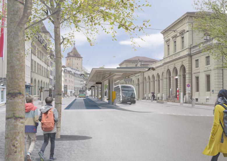 Heute reihen sich die Haltestellen vor der Bahnhofsfassade und vor den gegenüberliegenden Altstadtfassaden entlang und besetzen den Strassen- oder Platzrand.