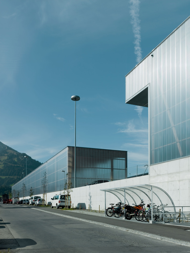 Den gross dimensionierten Freiflächen zwischen den beiden Hallen werden Baumreihen zugeordnet. Diese verbinden die Volumen der Hallen und unterstreichen die Zäsur vom Dorf zum Gewerbegebiet. Die linear angeordneten Elemente der Anlage bilden einen ruhigen Vordergrund für die Bergsilhouette, die Gewerbebauten an der Parallelstrasse werden hingegen weitgehend ausgeblendet.