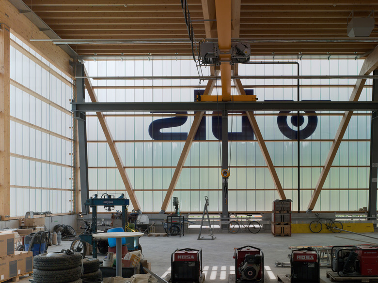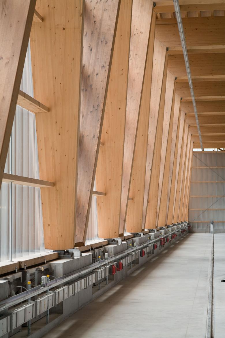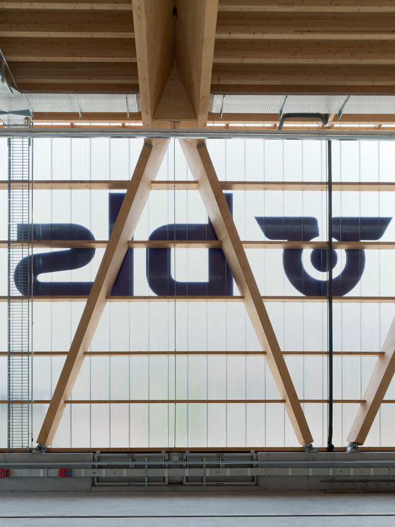 Die Architektur der Halle wird im wesentlichen durch zwei Punkte geprägt: Zum einen durch den industriellen Holzbau als Tragstruktur und zum zweiten duch die transparente Fassadenhülle aus Polycarbonatplatten. Das großflächig eingesetzte Industrieprodukt hat den Effekt einer besonderen Transparenz. In den Hallen ensteht eine angenehme helle Arbeitsatmosphäre. Das Halleninnere erscheint je nach Lichtverhältnissen in verschieden scharfen Umrissen. Nachts lassen die Stegplatten die Hallen als Leuchtkörper erscheinen. Die Kombination von bewährten und innovativen Elementen generiert einen soliden und zukunftsweisenden Ausdruck. Die transparenten Hallen vermitteln Zuverlässigkeit und Glaubwürdigkeit. Die extensive Dachbegrünung sowie die durchschimmernde Holzkonstruktion sind die sichtbaren Elemente des ökologischen Gedankens, welcher den Gebäuden zu Grunde liegt.