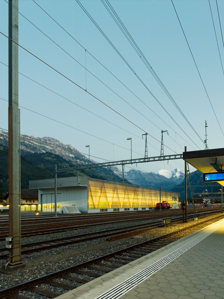 Der Standort der zwei Hallen am Bahnhof von Frutigen war durch die Geleiseanlage bereits vorgegeben. Es wurde eine möglichst einfache und doch ausdrucksstarke Konstruktion mit Holz erfunden welche es ermöglicht die Halle je nach Bedarf zu vergrössern, zu verkleinern oder gar zu verschieben. Die Gebäude sollten zuerst als Installationsplatz für den Ausbau des Lötschbergtunnel verwendet werden und später in die zwei Hallen “Intervention“, bzw. “Erhaltung“ umgewandelt werden.