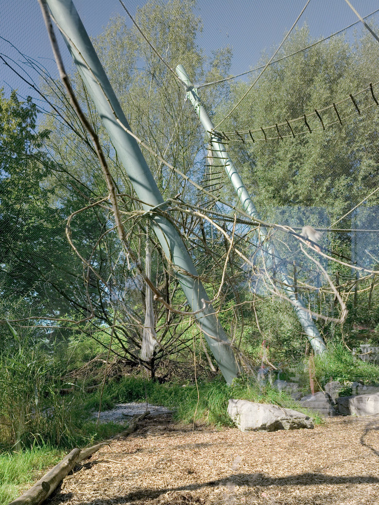 Das feinmaschige Netz ist nicht nur transparente Grenze, sondern gleichzeitig vertikale Spiel- und Kletterfläche für die Primaten. Es erlaubt eine optimale Sicht auf die Tiere und lässt die Form der Kuppel je nach Lichteinfall hell aufschimmern oder sich fast unsichtbar auflösen.