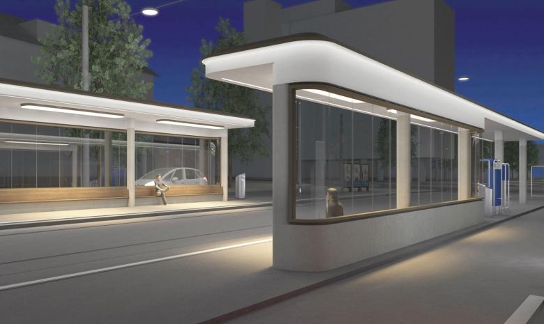 Zwei offene Wartehallen stehen sich gegenüber und spannen über die Tramgleise hinweg einen Raum auf. Ihre seitliche Abschlüsse beziehen sich aufeinander. Gemeinsam markieren sie das räumliche Zentrum des Zehntenhausplatzes. Für die Dauer der Umsteige- beziehungsweise Wartezeit wird durch das Zusammenspiel der beiden Hallen ein geschützter Aufenthaltsort mitten im pulsierenden Strassenverkehr gebildet – zwei Anlegestellen für Tram und Bus inmitten des steten Verkehrsflusses des MiV. In die jeweilige Fahrtrichtung des Verkehrs weiten sich die Perrondächer. Mit ihrer Länge von über 26.0 Metern schützen die ein- und umsteigenden Fahrgäste entlang der Haltekante zuverlässig vor der Witterung und versetzen die Haltestelle und den gesamten Platz in dynamische räumliche Bewegung.
