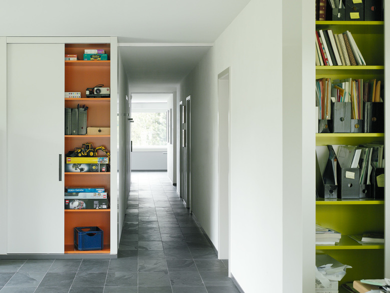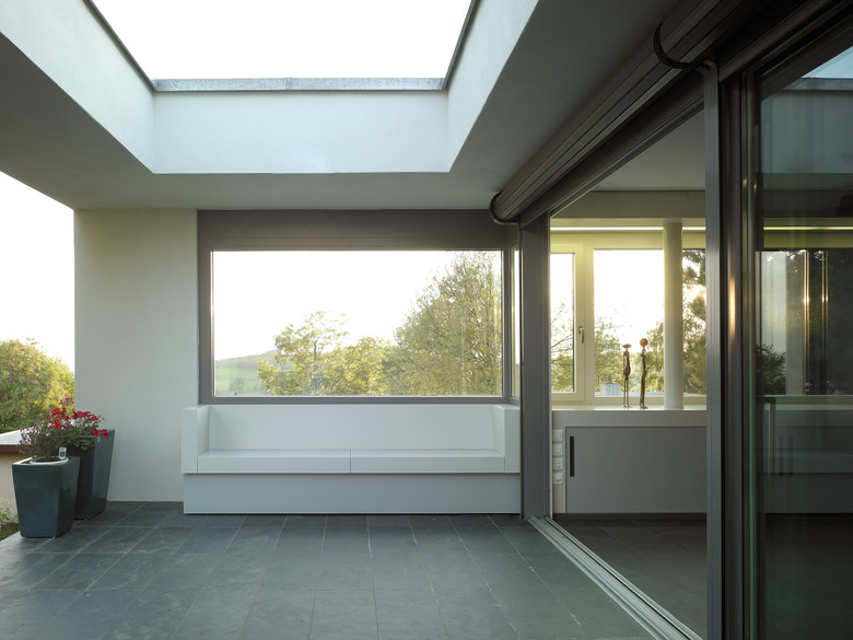 Neben diesen Anliegen verfolgten wir die Ziele, den Gartenbezug erlebbar zu machen, stärker zwischen öffentlicher und privater Seite zu unterscheiden und die bisher kaum erlebbare Aussicht zu thematisieren. Differenzierte Öffnungen im Osten, Süden und Westen des Volumens und die Offenheit der Anbindung der neuen Räume machten dies möglich. Die zugrundeliegende Raumabfolge Loggia – Wohnen – Gang – Büro – Loggia ergibt in West-Ost-Richtung eine Art Symmetrie, unter der sich alle weiteren Entscheide einordnen lassen. Auch die Fassadengestaltung folgt diesem Konzept: unter einem weissen Rahmen, der sich von Loggia zu Loggia spannt, steht der dunkel verputzte, beidseitig vollkommen offene „Wohnkörper“.