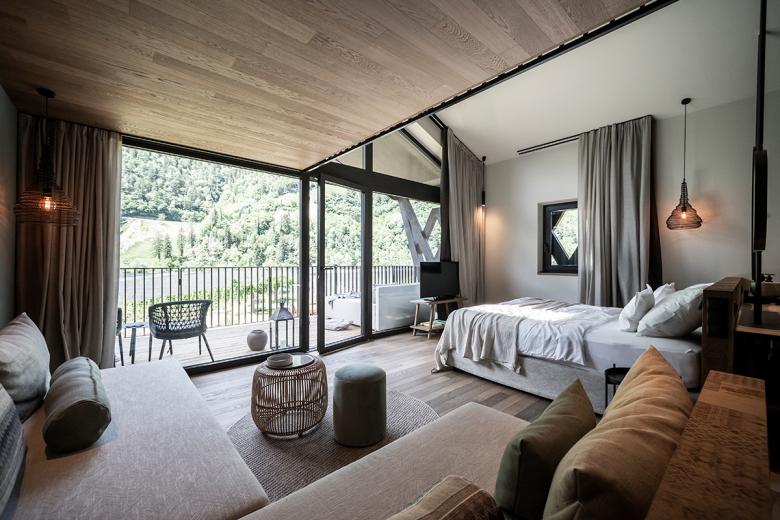 The suites on the ground floor blend into the topography. The entrance and adjacent bathroom are followed by a living and sleeping area which connects out onto the front terrace. Luxurious swinging hammocks with fluffy pillows, which are also seen in the wellness area, lend a relaxed, country flair. Nature and the characteristics of the region play an important role in the interior design. Wood cladding, milling, and coarse natural fibres are used throughout the entire inner decor - the materials run like a thread through all the rooms. The airy terraces are separated with an outdoor linen curtain.