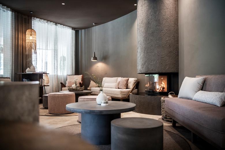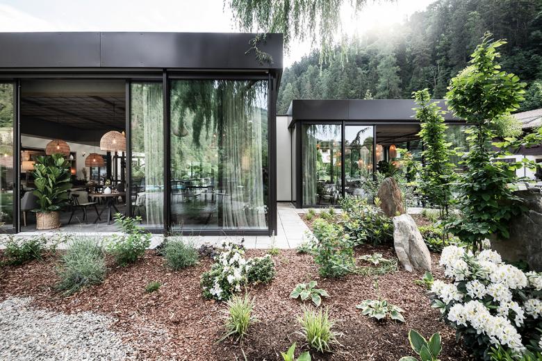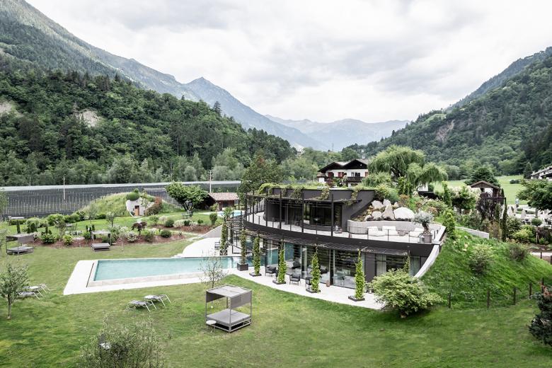 The newly opened wellness facility - the hotel’s new centrepiece - has no Northside facade, instead, it blends into a natural green slope so that the building can hardly be seen. The entrance to the new spa is a curved semi-exposed concrete shell that tucks into the landscape and is designed with a stunning portal made from old wood. Here, in the interface between the surface and subsurface, the word immersion takes on a meaning of its own. The Southside of the wellness area, on the other hand, opens up with a glass and steel facade that vanishes underneath a blanket of rooftop greenery. The steel canopy, on which fragrant jasmine flowers will climb, protrudes upwards into the open sky, reminiscent of the holding structures used in modern apple cultivation.