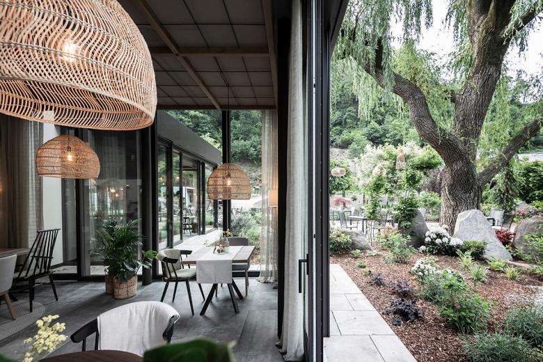 If you bypass the old barn and the impressive 40-year-old weeping willow, you’ll arrive at the hotel’s main building - the place where everything started. The hotel’s restaurant, which in recent years has gained particular popularity by guests coming from near and far, has expanded to include pavilions that roll out onto the garden. Two areas were created: closed, heated canopies, followed by open canopies with shading options grouped in clusters around a piazza of sorts. The grey-brown aluminium of the canopies is designed to harmonise with the warm grey floor tiles while contrasting with the main building’s plaster and wood.