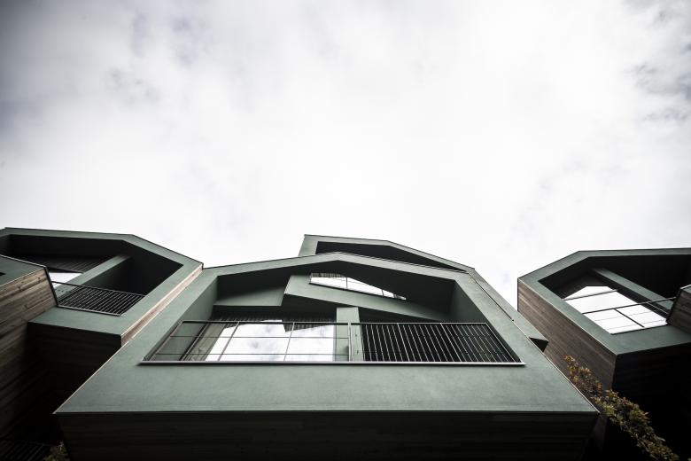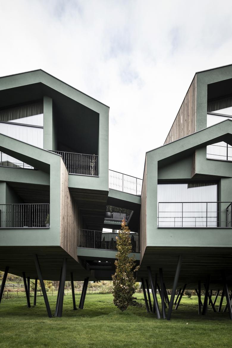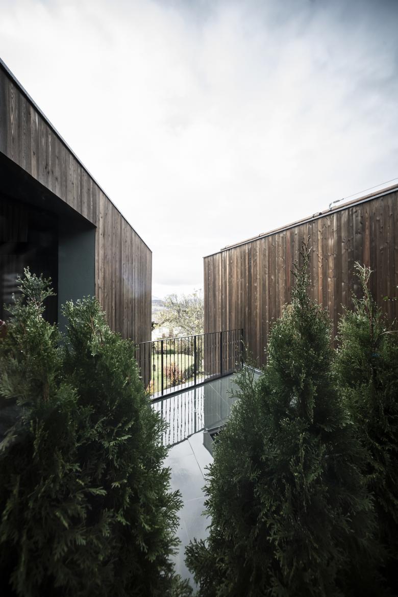 The intellectual concept of tree houses began to take shape: at the end of the connecting walkway that forms the backbone of the new development is the two-storey structure containing the suites, with five rooms on each floor, all of which have views over the park. In order to make the architectural complex even more dynamic, the rooms are located above each other at a slight angle, creating the impression of a natural, grown structure while preserving the views. Guests have the sensation of being ensconced in their own little house. Despite this architectural openness, the appearance of the whole building is preserved, as it nestles into the park landscape. This is anchored by a pre-grey wooden façade, which confers a degree of uniform tranquillity to the unique cluster of tree houses.