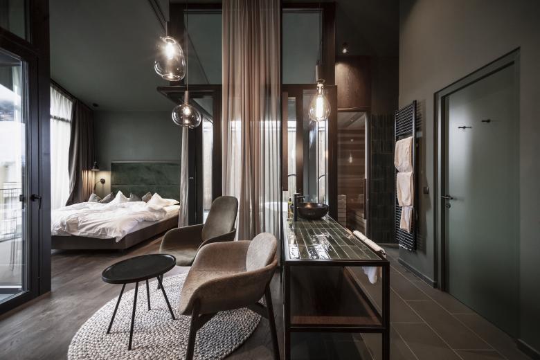 The new "Floris Green Suites" are no less spectacular inside than they are outside. The conventional living, bedroom and bathroom areas have been reimagined in an unusual way. The central living area opens out onto a sheltered balcony overlooking the magnificent mountain scenery, a benefit also afforded by the glass bedroom. Everything is confluent: Rooms, functionality, exterior and interior. Only the toilet and bidet has been designed as a self-contained unit. A free-standing vanity unit with mirror, which can also be used as a console desk, provides a pivotal point. This is where the bathroom area merges into the living area, which has been wonderfully designed with hybrid furniture. The most intimate area is located at the far end of the suite, where the entrance is: an open shower is elegantly flanked on one side by the self-contained toilet and bidet unit, and on the other by a small, private Finnish sauna, which guests can use whenever they wish. In addition to the many views and vistas, there is another highlight that makes a stay in the Green Suite irresistible: an open patio with an outdoor hot tub, which complements the sauna offer in an exceptionally appealing way.