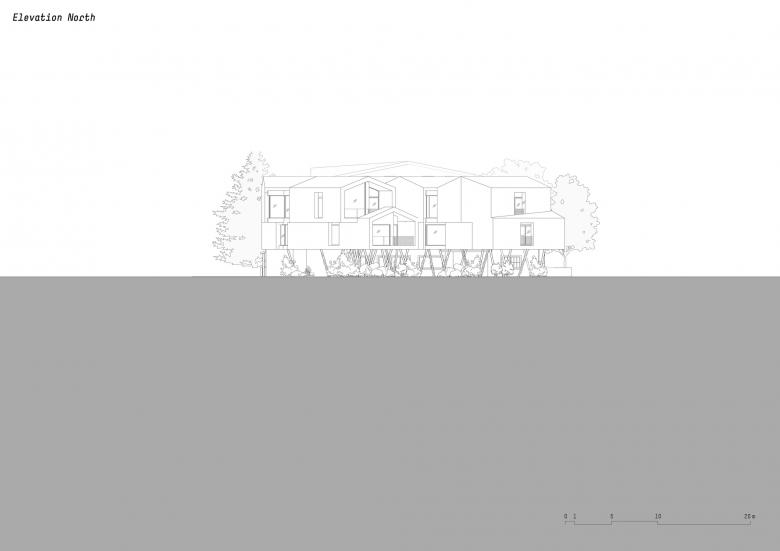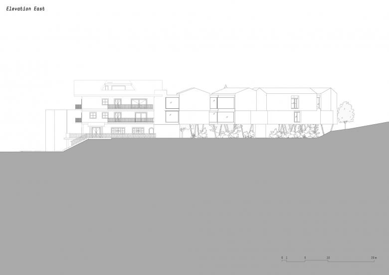 At the outset, the idea was to separate the building with the new suites from the original site in order to leave the grounds untouched and occupy as little space as possible. A building at ground level would have resulted in the loss of sizeable portion of the grounds. But the idea was not just a row of rooms door to door, but an orderly grouping of intimate, self-contained tree houses elevated on three-metre high supports, leaving the grounds fully accessible underneath. At the same time, there was a growing desire not only to accommodate guests in the new suites in the park, but to allow them to be a part of it. During the design process the park became the central theme of the architecture, thoroughly embedding the building within the nature, as if it had always been there.