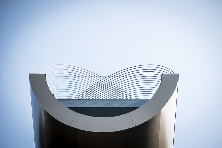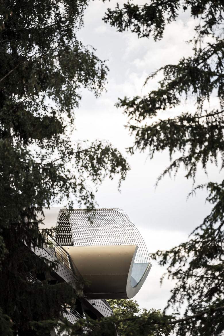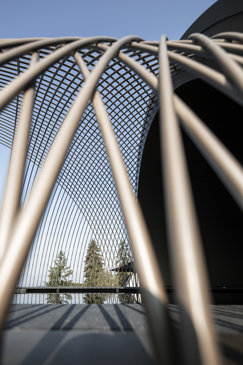 Nearly six meters deep, the curvature, the transparency and the gentle reflection create some sort of sculpture that reaches into the interior. When entering from the rear end, the pool is covered with a bronze-coloured rounded shell, which increasingly dissolves into a rounded net structure of poles, until one swims out under the open sky: an interplay between metal and water that creates a transition into boundless freedom. It is a process of soft fading out that dissolves this cylindrical shell and thus triggers the feeling of floating while enjoying the distant view. This almost sculptural appearing structure of poles is yet another interpretation of the ever appearing arch and the rhombus – closer observation allows one to see that the curved poles create a rhombus when intersecting. This may well be the summit of a journey that might have been imagined even before entering the building.