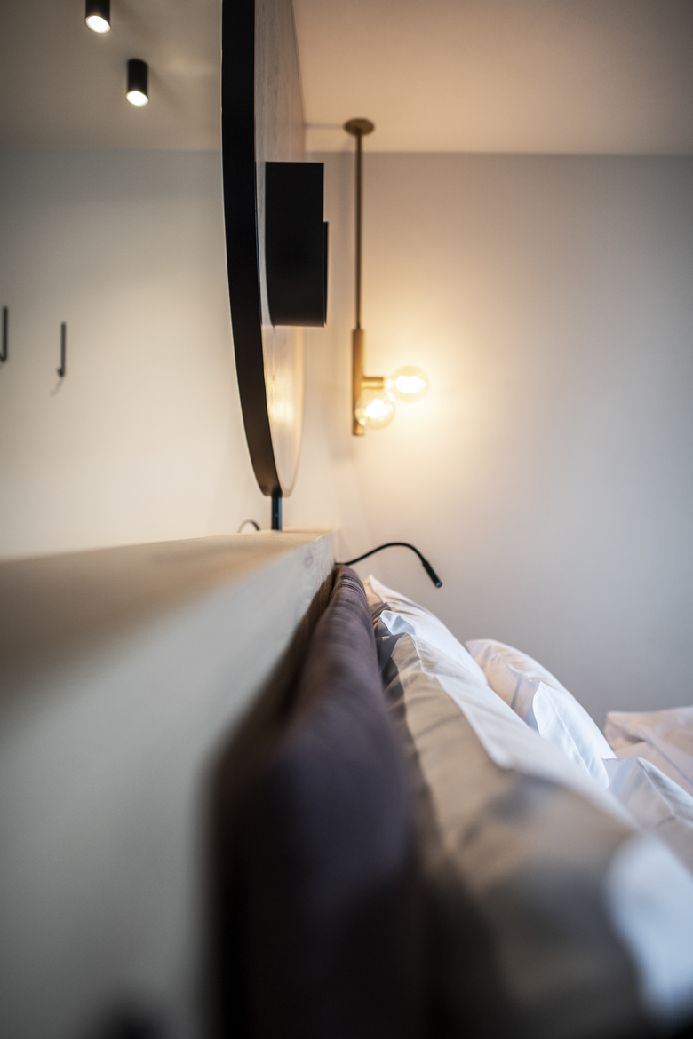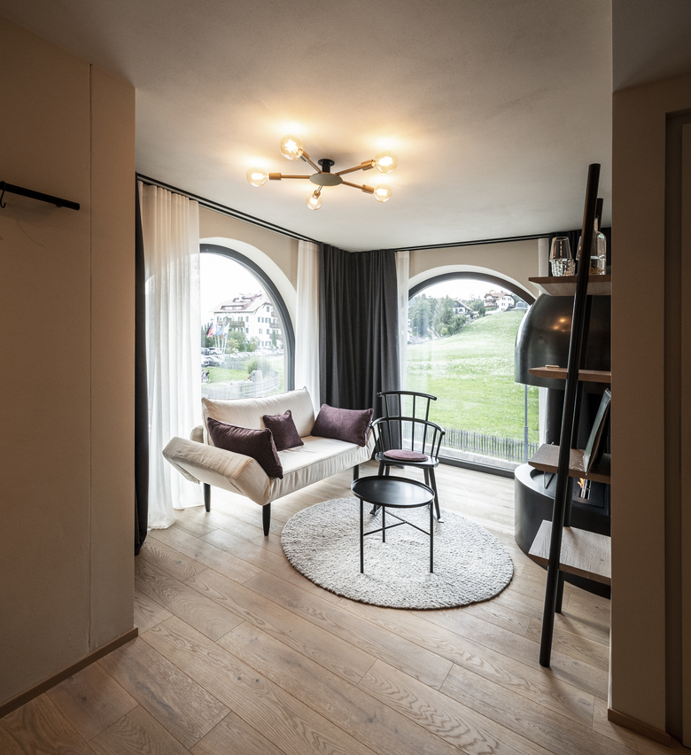 The timelessness of the Art Nouveau buildings at Ritten entail, is captured in the interior and carried out in an abstract manner. At the same time a kind of clear, contrasting and consistent framing of elements forms a recurring detail, which can be traced throughout the entire building. Also the theme of the arch finds its continuation in the interior, for example in the rooms as a mirror that is rounded at the bottom, as a fireplace in the lounge, where the arch is extruded around its own axis, or as the lounger’s backrest at the spa terrace. The furniture is mostly freestanding and loosely positioned, elegant and plain upholstery enhance the ambience. Amidst everything are unique finds from flea markets or little treasures from the previous hotel. Dispersed throughout the building are golden lamp sculptures hanging from the ceilings.