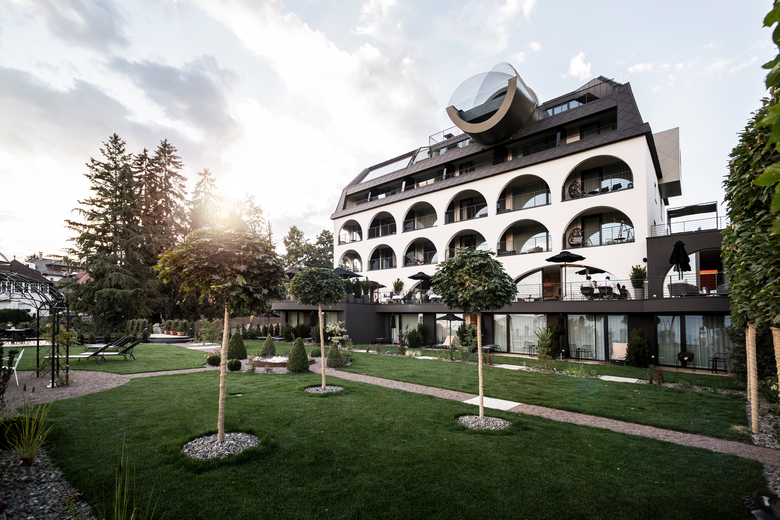 It was essential for noa* to incorporate locally prevalent elements, such as the arches in the façade, or the hipped roof, which looks back to a long tradition in the village of Oberbozen. At the same time, the rhombus is included; a decorative element that appears amongst the many railroad-houses along the Ritten railway, which connects the different summer holiday destinations. The holistic design approach is clearly visible: numerous details form a common thread running through the entire project. An interesting aspect is the organization of the hotel that sophisticatedly adapts to the topographic circumstances. The garage thrones the building and its 25 guestrooms, and on which the hotels park extends, from which the seven garden-suites and their private gardens can benefit with delight. Looking over the garden, one can find the public spaces: reception, lobby, the restaurant and it’s extending terrace, which gracefully curve out overlooking the garden with a view that extends to the far horizon. The blueprint and façade are developed in a close dialogue: what is hidden behind the façade can already be seen from the outside in a unique and unmistakable way, without revealing too much of what goes on in the inside.