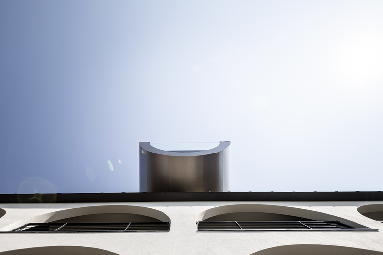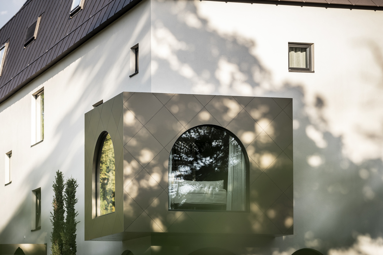 Above the public spaces, the guestrooms are located on three floors – with the suites on the respective edges of the building, clearly recognizable by their cubic bays, that set a confident architectural accent to the building’s façade. What begins on the ground floor as a flat double arch at the façade, develops through a significant leap in dimensions, into a concise uniaxial arched façade in the floors above. This allows the quality of the outer spaces to become more visible and tangible for the summer retreat. It is especially in this area behind the arcades, where inner and outer space merge – the loggias function as connecting elements, and with the frameless windows the room seams to continue as far as the parapet. The landscape is captured by the reflective black glass elements, which are used as balcony partitions dividing the rooms and which optically multiply the arched view. On the very top, clearly detached and with its hipped roof almost appearing as a building on its own, sits the wellness area. Here again, unmistakably, the element of the arch, which, as a bronze-coloured shell breaks through the roof structure and – positioned asymmetrically – sets a confident statement for a particularly lively architectural language.