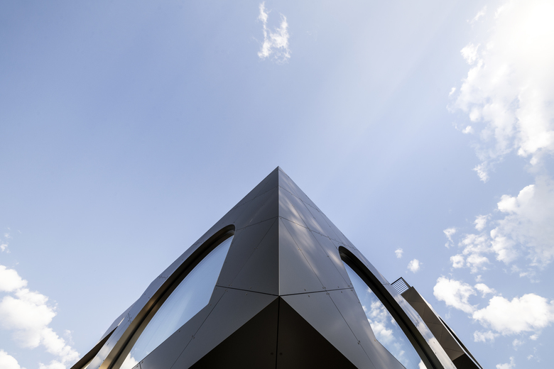 Certainly the biggest highlight, already visible from far off, is the spa area, with its extravagant cantilevered pool. In the spa area one finds expansive rest areas retreat zones, as well as some intimate terraces either on top of the bay windows, or cut into the roof, for a rest in the fresh air. A unique eye catcher, is the sweeping cylinder, which on the south side of the building drills its ways into the hipped roof and protrudes on the other side of the facade an upside down arch, serving as the exceptional pool. The shell, in which the pool is enclosed, is covered with the same bronze-coloured aluminium panels as the outside of the cubic bay windows. It forms a caesura to the dark brown hipped roof and allows for a fascinating play of reflections. On the inside, a few stairs lead to the centre of the cylinder. The automatic sliding door opens and one descends into the water, accompanied by the curved shell, one is lead towards the horizon in the infinity pool.