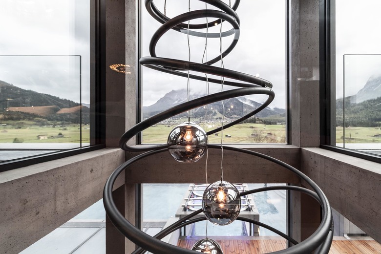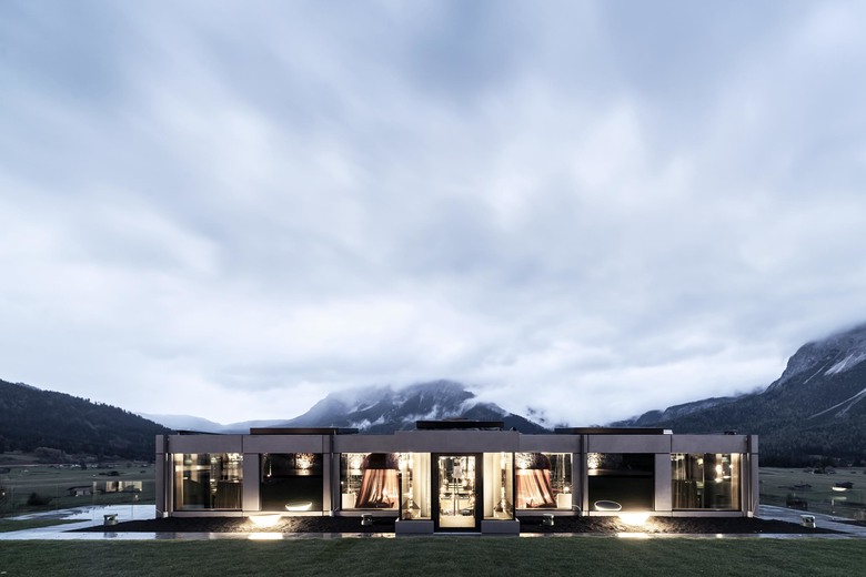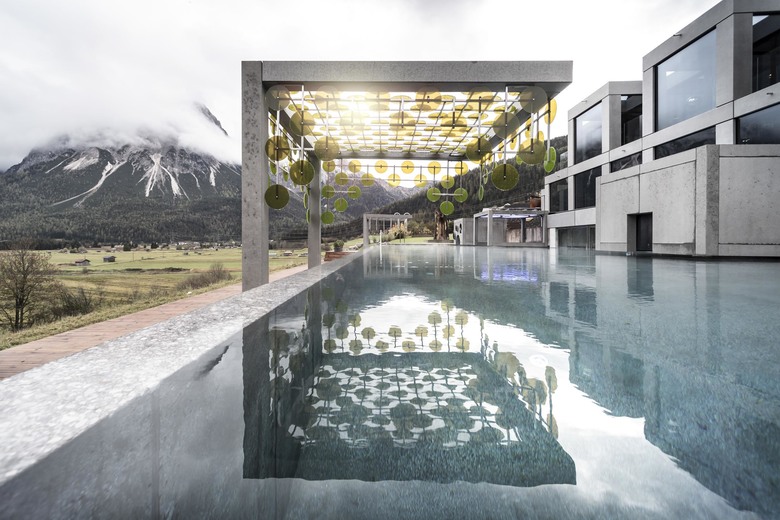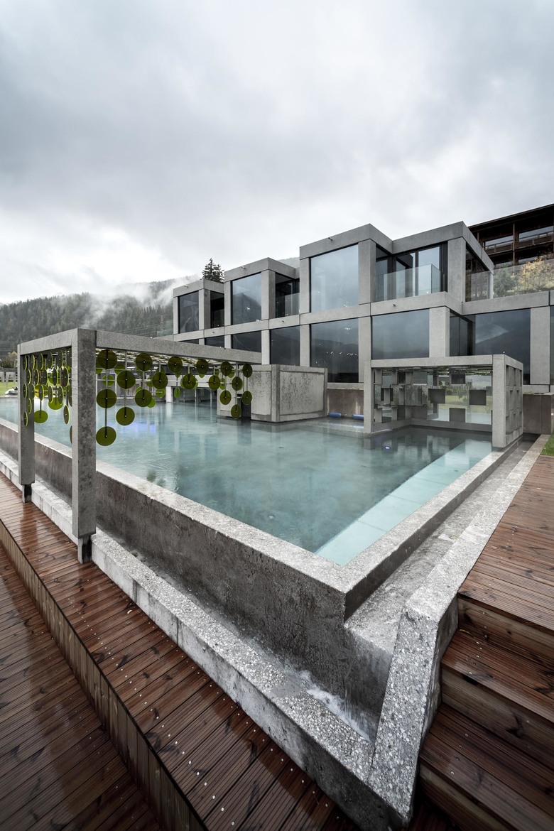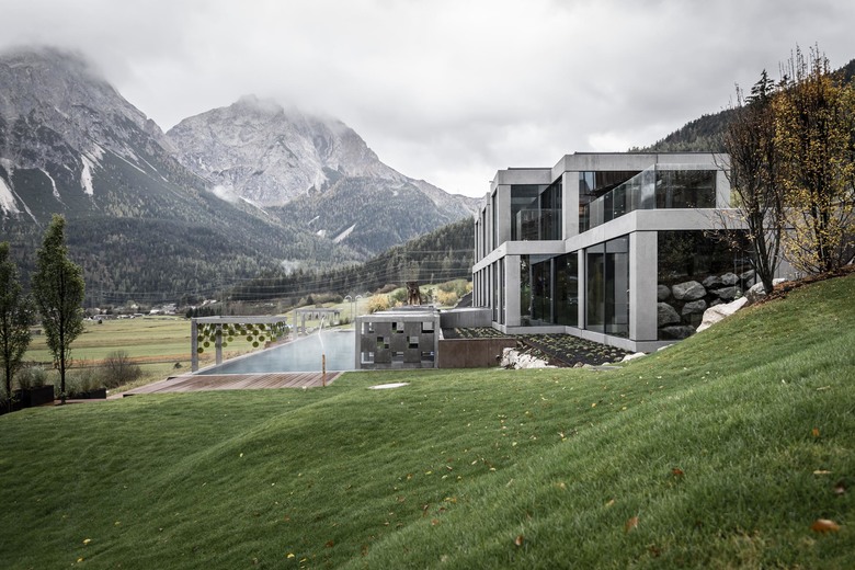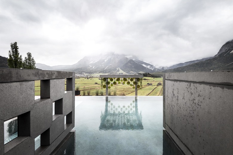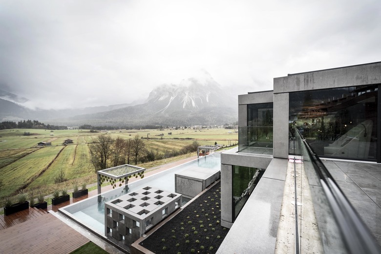 The new glass and cement structure was built organically on a gentle slope located below the hotel. It features a unique view across the spacious Ehrwalder Becken valley peppered with old farmhouses and barns; what’s more, the imposing 3,000 metres of the Zugspitze mountain – which represents a geographical border between Austria and Germany – overlooks the entire valley.