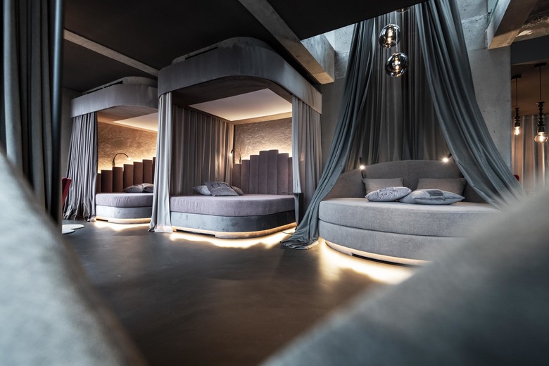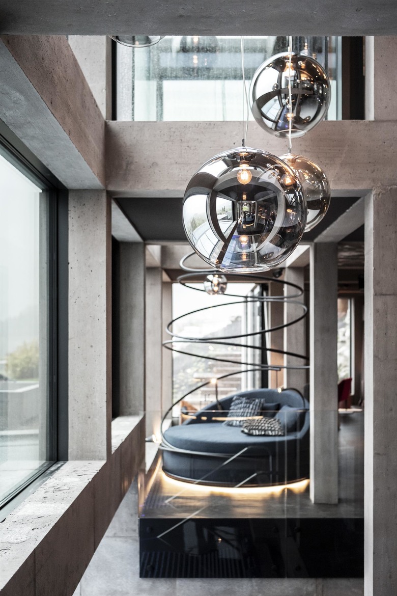 The relaxation areas were developed to look like theatre stages with a view across the mountain. Every ‘booth’ includes two deckchairs featuring different designs: open, spacious areas with huge swings hanging from the ceiling enshrouded by drapery or metal cones framing the mountain alternate with closed balconies delivering increased privacy and relaxation with an omnipresent mountain view.